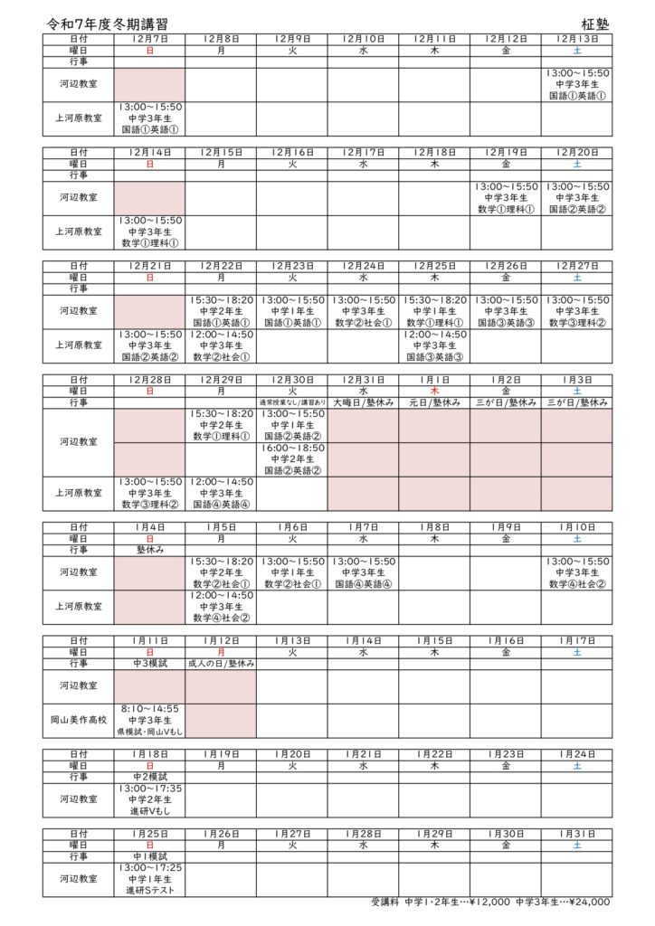 12月7日(日)より冬期講習が始まります。時間割は下の表の通りです。冬期講習は中学生のみの実施となっています。
